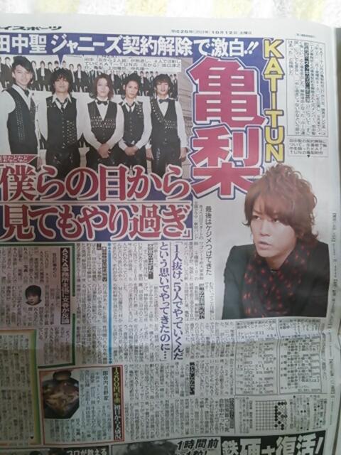 在前一節目《zip!》的最後,龜梨身著茶色外套登場,對於9日事務所發表與田中解除契約這一問題,他表示:“這件事,給許多人帶來了困擾,也讓許多人擔心,我在此表示萬分歉意。對不起”,現場謝罪。接著在《スッキリ》一開始,龜梨表示“我們是抱著想要5個人一直走下去的念頭走到了現在。感到十分後悔”,這是自2010年退團的歌手赤西仁(29)以來又一成員退團,對此表示了悔恨。