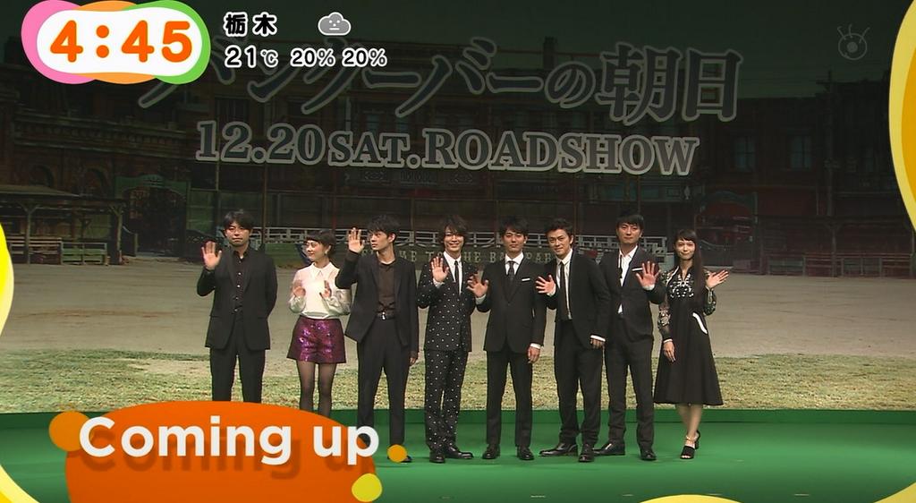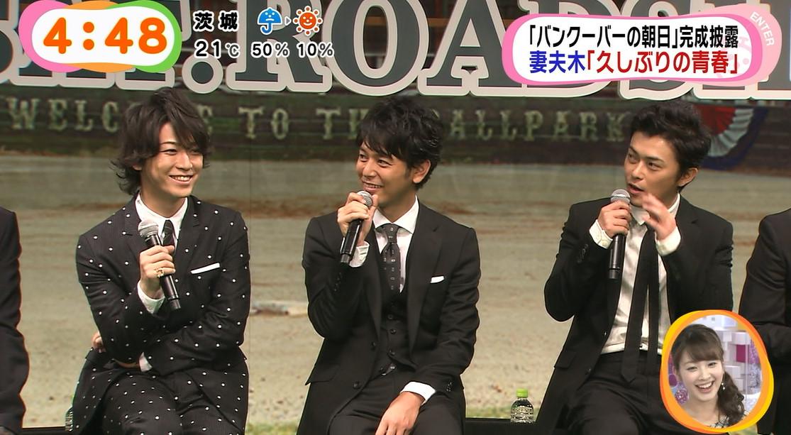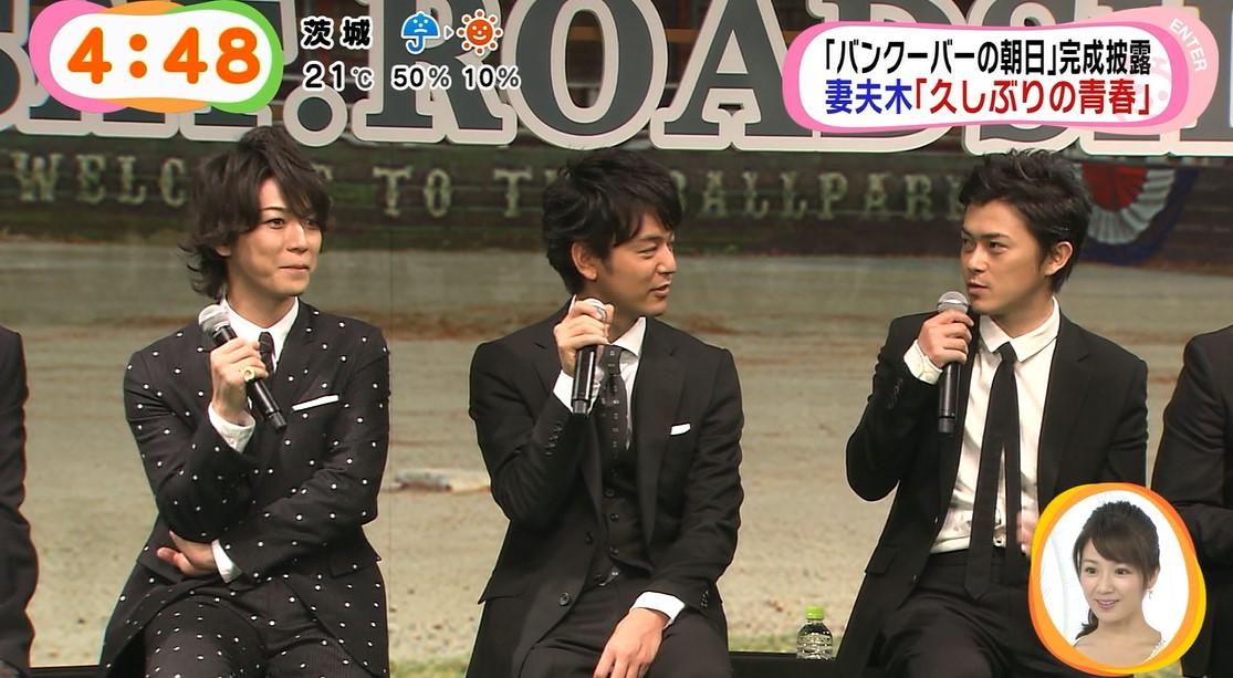 以實際存在於戰前的加拿大溫哥華的日僑組成的棒球隊“溫哥華的朝日”為題材的作品裏,飾演捕手トム三宅的上地「在工作日裏大家還來參加,有這麽多人來真的非常開心」這樣打了招呼之後、說「我們也一直很期待今天、kame(烏龜)(亀梨)也很期待於是從水坑裏吧唧吧唧的過來,西裝就變成了這個樣子」。