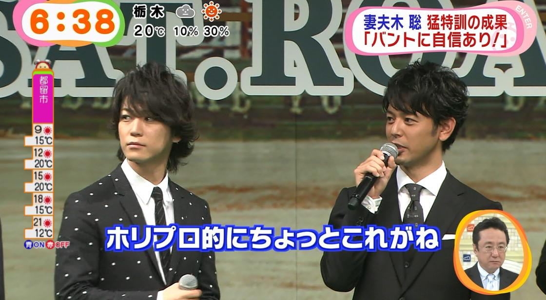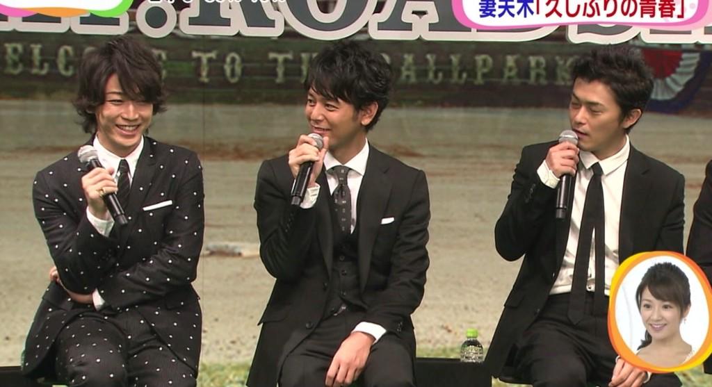 主将役なのに、野球経験がほとんどない妻夫木聡(33)は、公園で自主練して備えたことを明かして「気持ちは朝日軍なんだけど、体は(思うように動かない)33歳だった」と笑顔。「KAT―TUN」の亀梨和也(28)は、地元チームと草野球をやったことを披露して「大敗したので、みんなで土下座して1イニング延長を頼みました」と話していた。