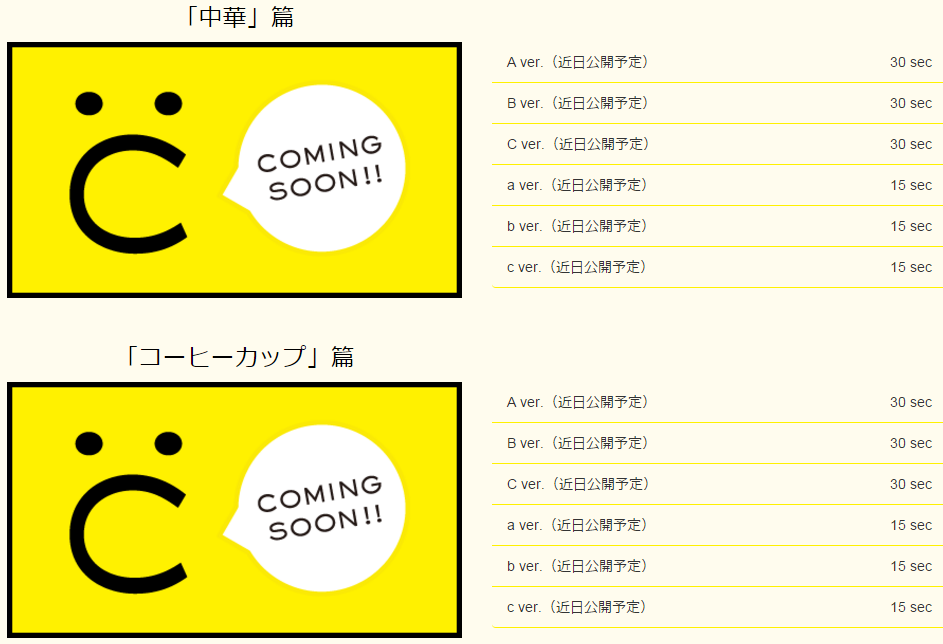 CMは、なぜかメンバーの話題についていけず取り残された中丸さんが印象的な「中華」篇と、メンバー全員でコーヒーカップに乗りながらおかしなアクセントで楽しそうに会話し続ける「コーヒーカップ」篇の2種類をオンエア。
