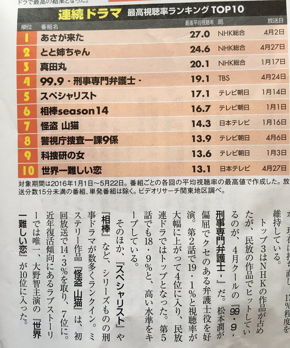 [消息] 20160709 日経エンタメ2016上半年各樣排名