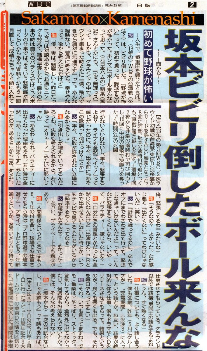 在對談後的拍照,龜梨「不動的話(表情)會就僵硬」提出建議的一幕。對這個回應的坂本「沒有1次1次改變姿勢的棒球選手之類吧」。如果以差3年的關係來看, 2人就像「好大哥」與「可愛弟弟」。各自背負巨人和傑尼斯"招牌"的責任感,苦惱等想法有很多相通。彼此,從不同世界接受的刺激絕對不是小事,通過對談傳達到了。