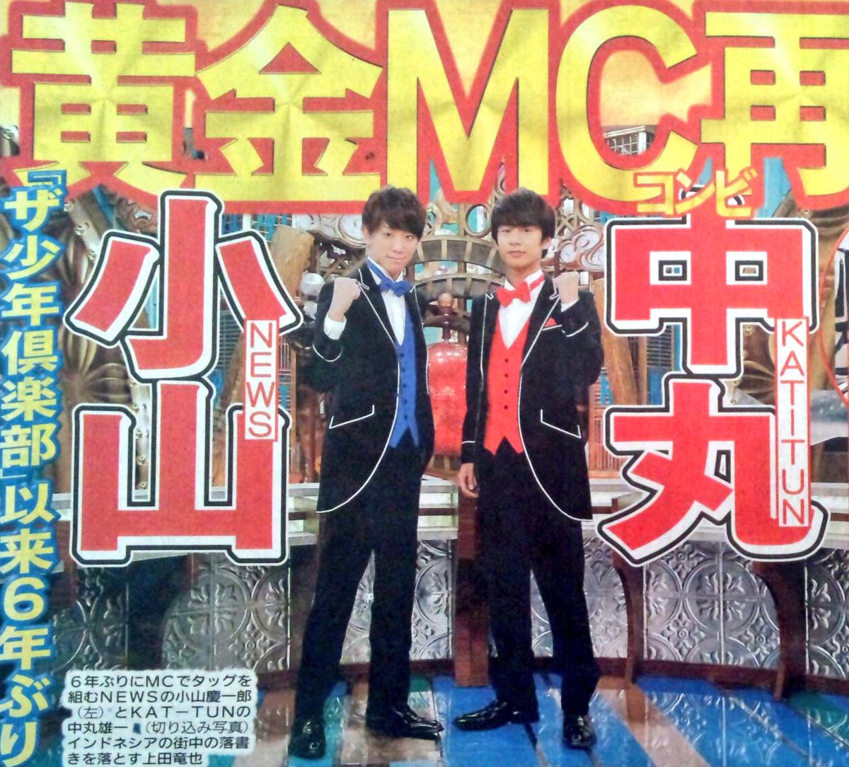 得知人氣組合·NEWS的小山慶一郎和KAT-TUN的中丸雄一在6月14日播放富士電視台系SP綜藝節目『幫助JAPAN』(晚7:00)擔任MC。在NHK BS Premium的音樂節目『the少年俱樂部』2006年~2011年擔任第一代主持進行角色以來時隔6年的組合復活,宣佈集合2人作為首次地上波節目MC一如以住一唱一和。