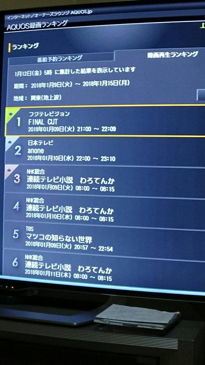 [情報] 20180116 ドラマ「FINAL CUT」~ AQUOS預録再生率1位